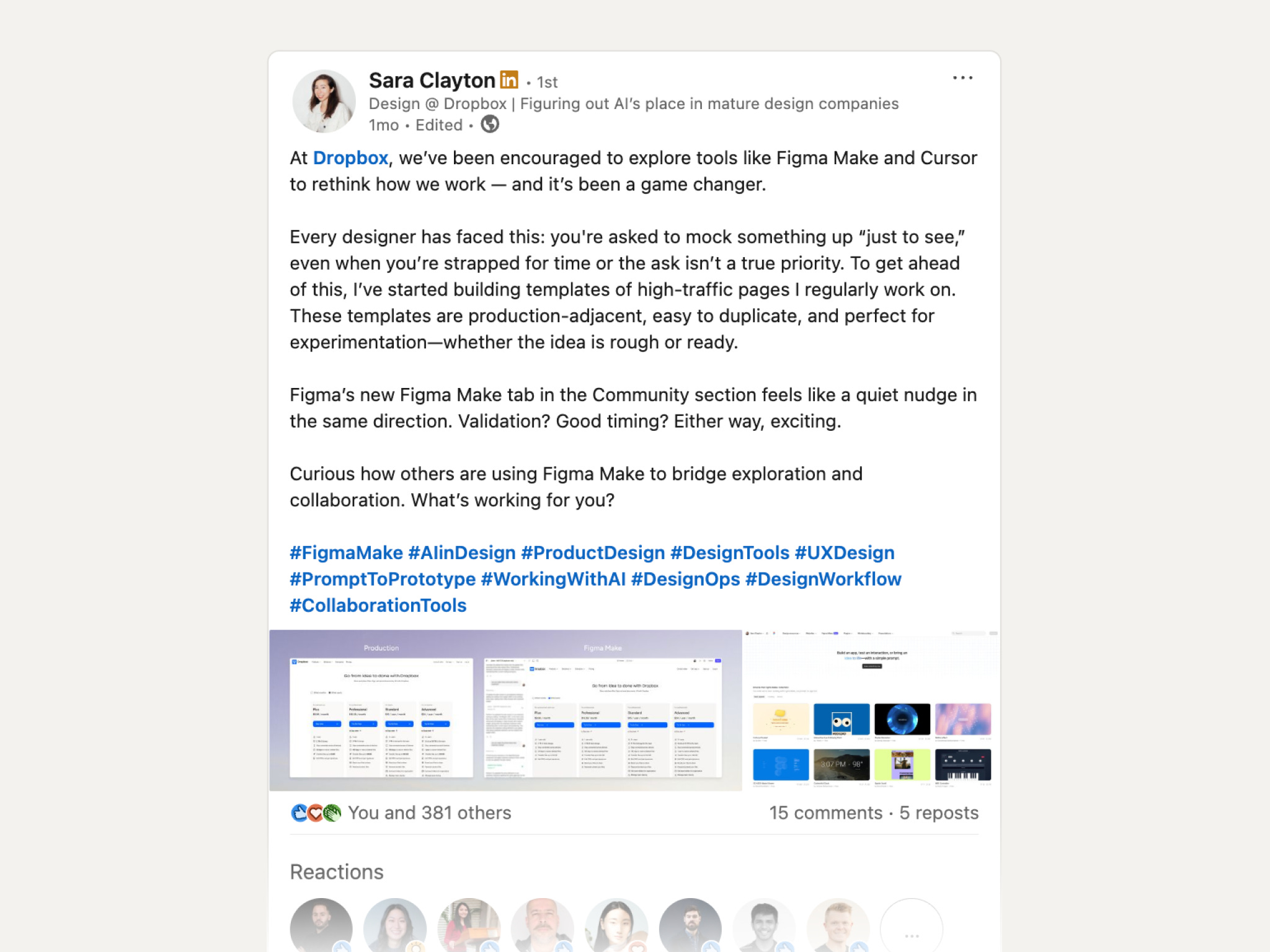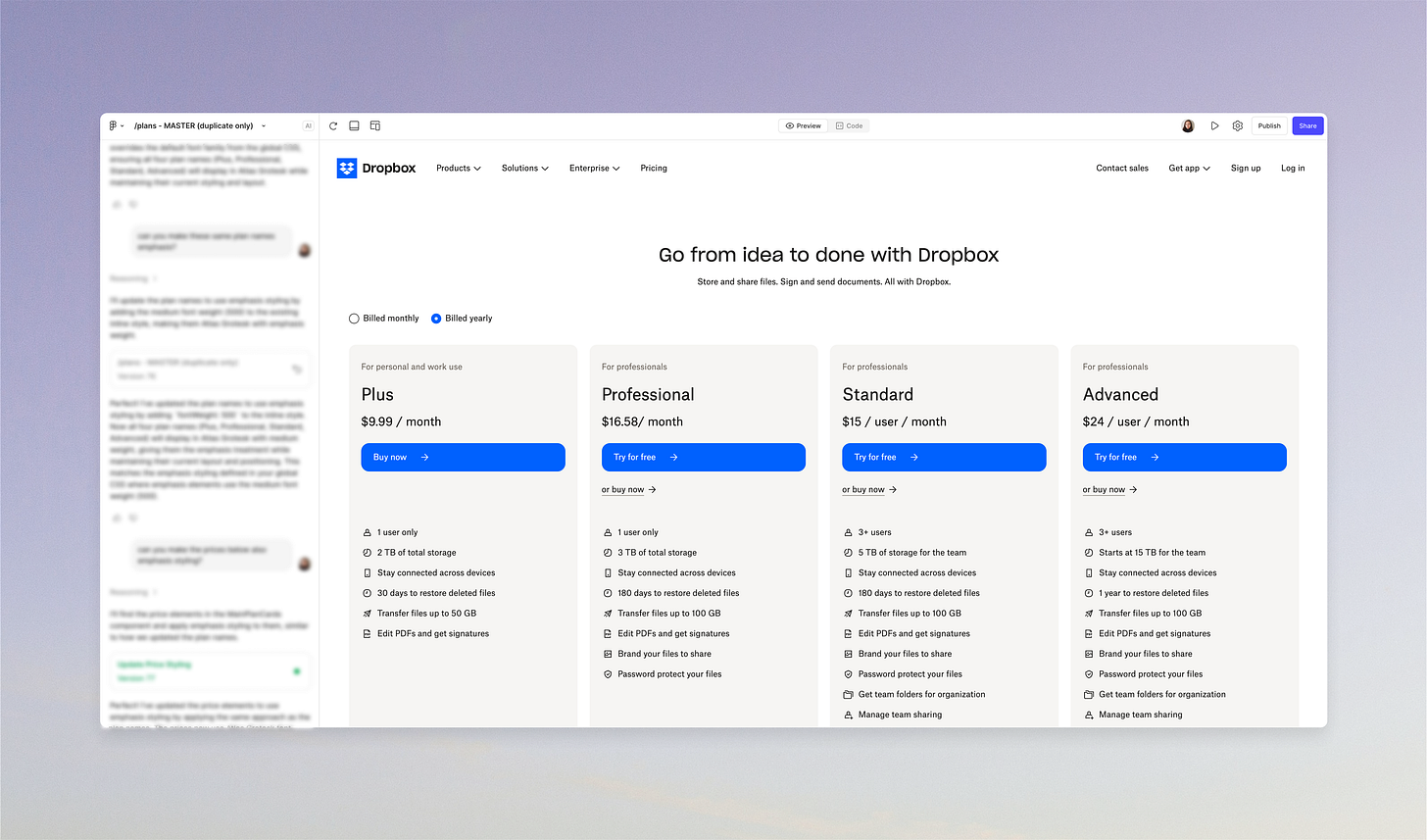 Recently, on a whim, I posted about how I’ve been experimenting with Figma Make – building out a few page templates to help collaborators explore ideas. Below is an example I used in the post of how I leveraged Figma's new AI tool to prototype at Dropbox and test ideas.